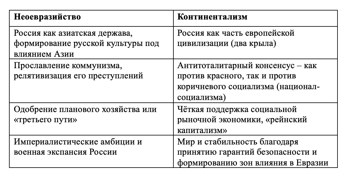 Можно ли сопоставить континентализм с русским неоевразийством? Нет, по нескольким важным причинам. Отправная точка неоевразийства заключается в утверждении, что Россия по своем существу — азиатская страна. Неоевразийцы прославляют коммунизм, релятивируют и замалчивают его преступления, одобряют неэффективное и экономически провалившееся плановое хозяйство или так называемый «третий путь» – своего рода гибрид рынка и плана, напоминающий экономико-политического Франкенштейна. Континентализм выступает за мир и стабильность в Европе, неоевразийство говорит о новом русском империализме, то есть подразумевает и военную экспансию.