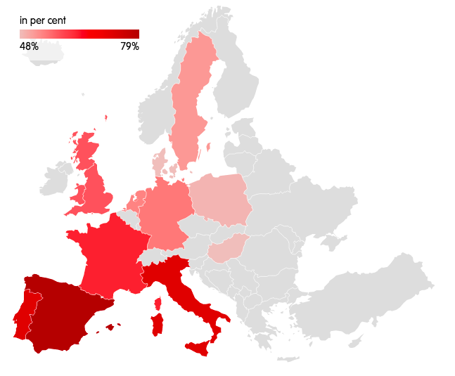 Контраст в настроениях заметен, если смотреть на разные регионы Европы. В Южной Европе большинство говорит, что политическая система ЕС никуда не годится. В Северной Европе (Дании, Швеции, Германии и Нидерландах) и Центральной Европе (Польше и Венгрии) большинство людей, напротив, положительно отзываются о работе системы. Отношение людей к политическому устройству ЕС нередко совпадает с их взглядами на политическое устройство своей страны. В Северной Европе большинство граждан убеждены, что в их странах политическая система работает без сбоев, и у многих респондентов это вызывает веру в успешность ЕС. В отличие от них, большинство жителей Испании, Италии и Франции негативно относятся к политическому устройству своих стран и считают, что политическая система ЕС никуда не годится. Исключением из этого правила являются Польша, Португалия и Венгрия, где большинство людей полагает, что в их странах политическая система неадекватна, но они видят своё спасение в Брюсселе.