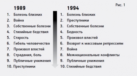 Сопоставление данных опросов ВЦИОМа 1989 г. и 1994 г. показывает, как постепенно снижалась острота страха войны. На первый план в 1990-е гг. выходят социальные и экономические страхи (преступности, бедности):