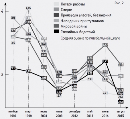 Показательна и динамика ответов на вопрос: «Боитесь ли вы и в какой мере…..» (оценка по пятибалльной шкале), приводимая Левада-Центром (опросы 1994–2015 гг.) (Рис. 2). Как следует из диаграммы, страх войны постепенно снижался с 1994 г. до 2008 г., в то время как нарастал или был более выражен страх потери работы, нападения преступников или произвола властей.
