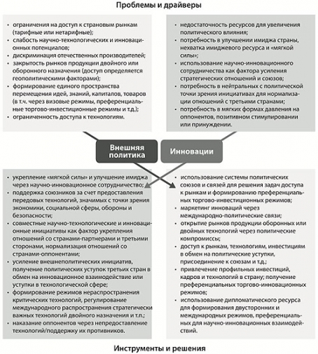 Все это свидетельствует о значении внешней политики в сфере инноваций, и, наоборот, инновационного потенциала – для дипломатии. В реальности подобных пересечений еще больше, и все они требуют учета. Схема иллюстрирует существующие взаимосвязи.