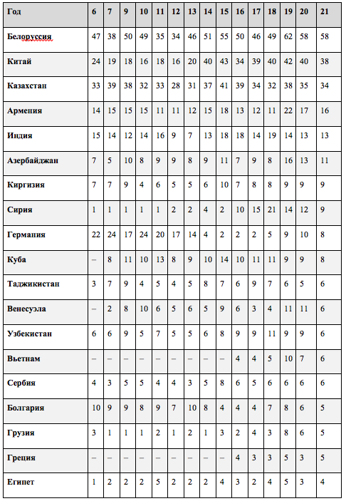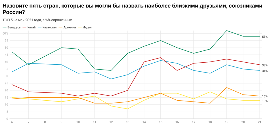 Россияне продолжают считать Белоруссию наиболее дружественной страной (такого мнения придерживаются 58 процентов). Этот показатель рос с 2013 г. и последние три года стабилизировался на отметке 58–62 процента. Второе место устойчиво занимает КНР (38 процентов) – колебания в пределах статистической погрешности за последние несколько лет. На третьем месте – Казахстан (34 процента), здесь – некоторое снижение с 2019 года. В десятку также вошли Армения, Индия, Азербайджан, Киргизия, Сирия, Германия (единственная европейская страна в топ-10) и Куба.