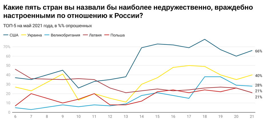 Главной недружественной страной для России соотечественники считают США, при этом по сравнению с августом 2020 г. это мнение выросло на 6 процентных пунктов, хотя до показателя 2018 г. в 78 процентов ещё далеко. На втором месте – Украина (40 процентов – на 5 процентных пунктов больше, чем в 2020 г.). На третьем месте – Великобритания. Также в первую десятку попали прибалтийские страны: Польша, Германия, Грузия и Чехия (впервые за всё время наблюдений)
