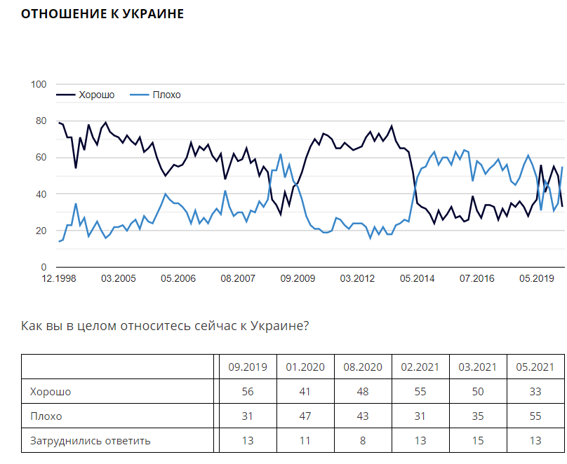 Значительнее всего изменилось отношение россиян к Украине. Ещё в марте половина респондентов (50 процентов) относились к этой стране хорошо, плохо – 35 процентов. В мае 2021 г. ситуация обратная: 33 и 55 процентов соответственно. Показатели вернулись к уровню начала 2019 года.