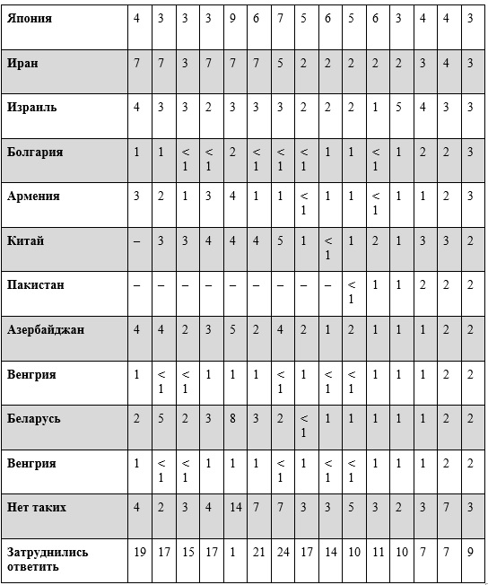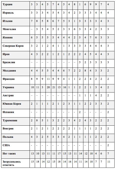 Респондентам предлагалась карточка со списком стран, и они могли назвать несколько государств. Ответы ранжированы по убыванию по результатам 2021 года. В таблице приводятся страны, набравшие в мае 2021 г. ≥ 1,5%)