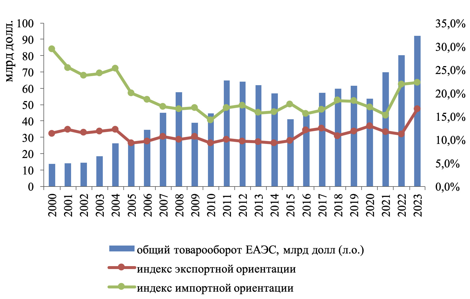Рисунок 1. Основные торговые показатели стран – участниц ЕАЭС в 2000–2023 годах