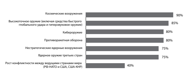 На первом месте – «космические вооружения», на которые указали 90% экспертов. Высокоточное оружие (включая средства быстрого глобального удара и гиперзвук) занимает второе место – его упомянули 85% опрошенных. Далее следуют противоракетная оборона (ПРО) и кибероружие (оба фактора упомянули 80% респондентов), ядерное оружие третьих стран (75%) и нестратегические ядерные вооружения (75%). Остальные факторы присутствуют в ответах менее половины опрошенных. Наиболее значимым можно назвать различные интерпретации роста конфликтности между ведущими странами мира, прежде всего, Россией и США/НАТО, США и КНР, «запада» и «востока» в целом – так считают 30% участников опроса. 10% ответов непосредственно касаются кризиса вокруг Украины, другие 20% – новых средств доставки ядерного оружия. (см. Рис. 1).