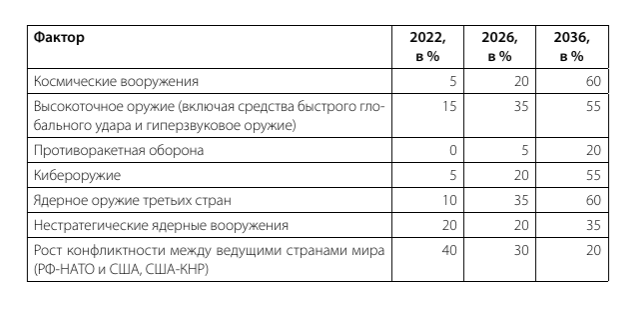 Таблица 1. Оценка уровня влияния отдельных факторов на стратегическую стабильность по состоянию на 2022, 2026 и 2036 гг.