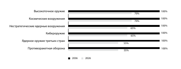 К 2036 г. список наиболее «влиятельных» факторов претерпит значительные изменения. Так, на первое место должны выйти космические вооружения («существенное» влияние – двенадцать), а также ядерное оружие третьих стран (двенадцать ответов). Весьма близко к ним будет находиться высокоточное оружие, которое несколько утратит свои лидирующие позиции по сравнению с 2026 г., а также кибероружие (по одиннадцать ответов).