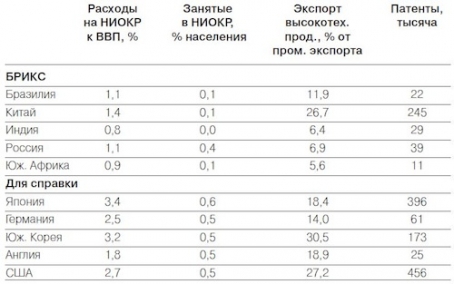 Таблица 1. Ключевые индикаторы развития технологий для стран БРИКС и некоторых развитых стран, 2007