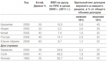Таблица 2. Показатели неравенства в группе БРИКС, США, Германии и Японии