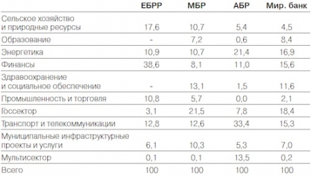 Таблица 3. Распределение кредитов, выданных некоторыми банками развития, по отраслям, 2010 г., в % к общему объему кредитов