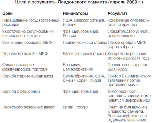 Намерение G20 осуществить международную кооперацию остается пока довольно общим и неконкретным. К примеру, в ходе Вашингтонского саммита (ноябрь 2008 г.), проходившего в наиболее острый период финансового кризиса, практических договоренностей достигнуто не было. На Лондонском саммите (апрель 2009 г.) удалось договориться лишь об увеличении объема ресурсов МВФ, но не о принципах модернизации мировой финансовой системы.По многим вопросам страны-участницы придерживаются кардинально отличных подходов (см. таблицу), поэтому новая архитектура будет плодом длительной конкуренции множества вариантов. Звучащие предложения носят компромиссный характер и в определенной степени учитывают запросы Германии, Франции и крупных развивающихся стран. Но в целом в острый период рецессии в выигрыше остались англосаксы: они избежали необходимости брать на себя серьезные обязательства, а наднациональный контроль им уже не угрожает.