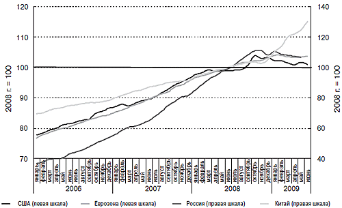 Динамика накопленного объема выданных кредитов банками США, Еврозоны, России, и Китая (2006–2009 гг., среднее за 2008 г. = 100)