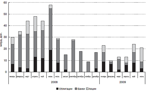 График 3 показывает драматическое сокращение перетока финансовых ресурсов из западной частной финансовой системы в развивающиеся страны. В первом полугодии 2008 года общее финансирование составляло свыше 250–260 млрд долларов, а в аналогичный период 2009-го оно едва превысило 100 млрд долларов. На несколько месяцев в конце 2008 года финансовая система практически остановилась (часть потоков, видимо, относилась к офшорам). В такой ситуации развивающиеся страны оказываются почти в полной зависимости от международных финансовых институтов.