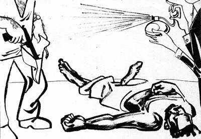 Шарль де Голль с большим апломбом славит атомную бомбу, Говорит он, что Париж видит в этом свой престиж. Ради этого престижа, Что писаками воспет, От натуги нажил грыжу Государственный бюджет. Каждый год одну примету Видит Репюблик Франсэз: К атомной статье бюджета Прибавляют новый вес. Вес огромен! Я предвижу, Что в бюджете этот факт Вскоре сможет, кроме грыжи, Вызвать подлинный инфаркт! А. Безыменский Крокодил, N 18, июнь 1964 г.