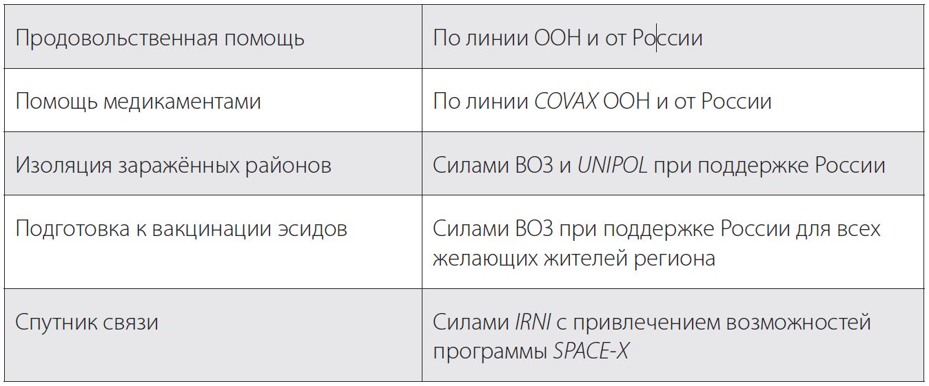 - Формирование сообщества сопредельных государств, готовых предоставить средства и территории для насущной и перспективной помощи эсидам (включая локализацию их поселений на своей территории).