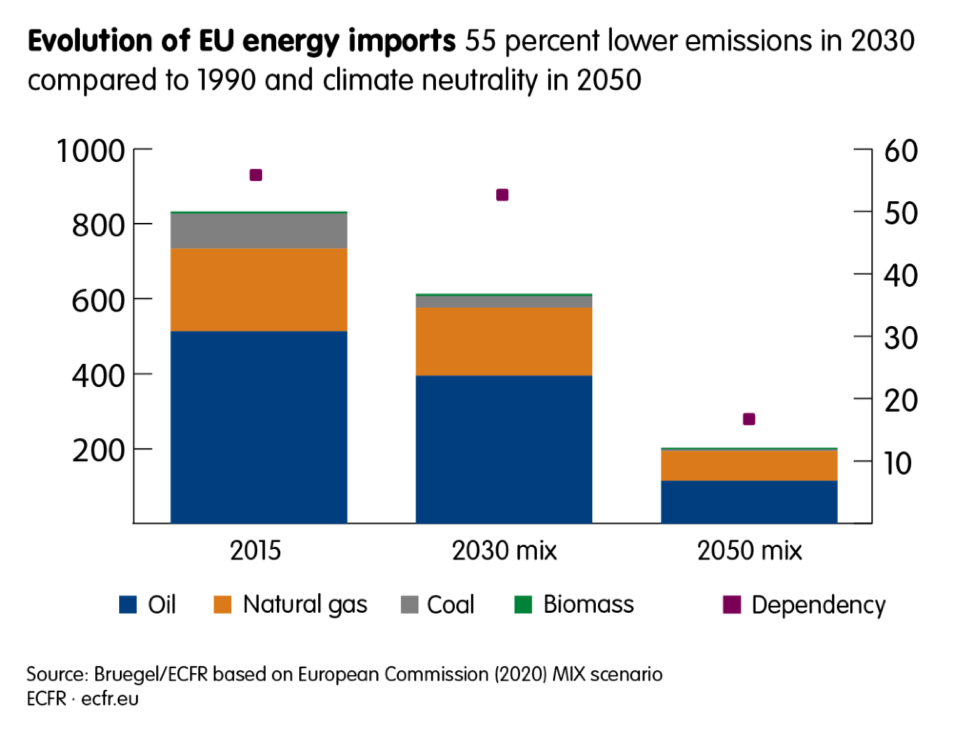 В этом контексте Зелёный курс окажет серьёзное воздействие на Россию. В 2016 г. нефтегазовые доходы составили 36 процентов российского бюджета, а на Европу приходилось 75 процентов российского экспорта природного газа и 60 процентов экспорта нефти. В ближайшие десять лет торговля нефти и газа между Россией и ЕС не будет затронута, поскольку Европа планирует лишь незначительно сократить импорт нефти и газа к 2030 г., даже при 55-процентном уменьшении выбросов. Но после 2030 г. ситуация кардинально изменится: Европа существенно сократит импорт нефти и газа. Евросоюз может переключиться с поставщиков с углеродоемкими технологиями добычи, как в России, например, на Саудовскую Аравию, где уровень выбросов почти вполовину меньше.