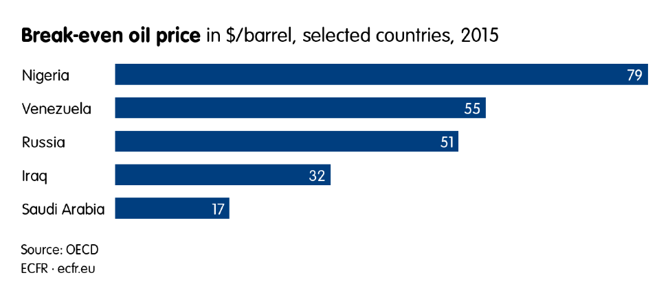 Например, Саудовская Аравия и Ирак могут производить нефть достаточно дешёво, покрывая затраты при цене около 30 долларов за баррель или даже меньше, в то время как России, Венесуэле и Нигерии нужна более высокая цена, чтобы выйти в ноль (см. диаграмму 5).