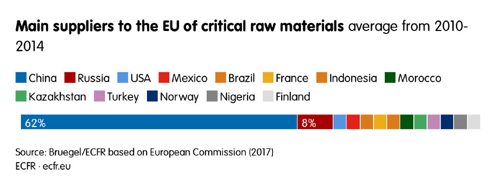 Зависимость Европы от Китая только увеличится с ростом спроса на «зелёные» технологии. По оценкам Joint Research Center, потребности ЕС в сырьевых материалах для ветровых турбин увеличатся в 2–15 раз в ближайшие тридцать лет. В целом Еврокомиссия ожидает удвоения потребностей в новых сырьевых материалах к 2050 году.