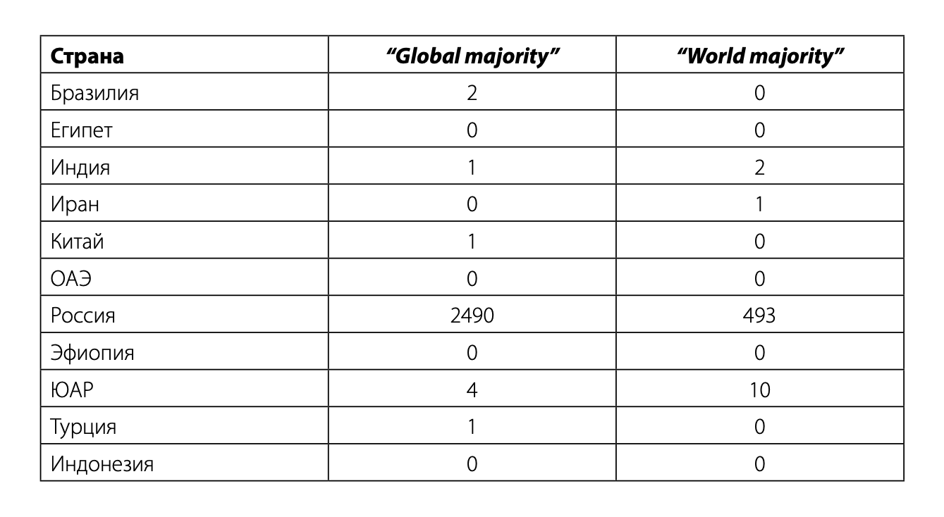 Заслуживает внимания, однако, то обстоятельство, что понятие мирового большинства не получило (пока?) признания тех, кто его составляет. На интернет-сайте премьер-министра Индии Нарендры Моди “global majority” не упоминается ни разу, а “world majority”[4] лишь однажды в выступлении о проблеме изменения климата в ноябре 2015 года[5]. Сайт МИД Китая на русском языке также не употребляет это понятие[6]. В таблице приводится результат поиска по запросам “global majority” и “world majority” на сайтах лидеров государств и министерств иностранных дел ключевых стран мирового большинства (в данном случае были взяты страны БРИКС, а также Турция и Индонезия как крупные незападные региональные державы).