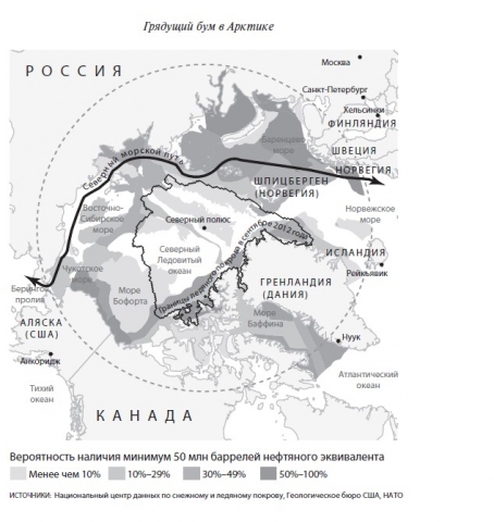Какие бы рецепты борьбы с глобальным потеплением ни предлагались, факт остается фактом: оно действительно имеет место. Однако не все так плохо. То, что когда-то было непроходимыми арктическими льдами, окруженными пустынной территорией вечной мерзлоты, постепенно превращается в эпицентр промышленности и торговли наподобие Средиземного моря. Тающие льды и потепление прибрежных районов открывают доступ к богатым залежам полезных ископаемых, включая почти четверть всех имеющихся в мире запасов нефти и газа и гигантские месторождения ценных металлов и минералов. Летние морские пути через Арктику позволяют сократить на тысячи километров расстояния между Тихим и Атлантическим океанами. Региону предстоит стать главной трассой для мирового торгового флота, подобно тому как он уже превратился в один из магистральных воздушных коридоров для гражданской авиации.