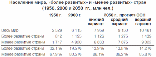 Северные, «более развитые» регионы никогда не составляли большинства мирового населения. В начале ХХ века там было сосредоточено примерно 30 % жителей планеты, к середине столетия эта доля немного выросла, но и тогда не достигла даже трети мирового населения. Однако затем началось стремительное падение доли Севера, которая к концу века опустилась ниже 20 % и продолжает быстро снижаться. Согласно среднему варианту прогноза ООН, к 2025-му она упадет ниже 16 %, к 2050 году будет составлять менее 14 % (табл. 1), или в 2,4 раза меньше, чем за сто лет до этого, в 1950-м. Примерно то же предполагается по верхнему и нижнему вариантам прогноза.