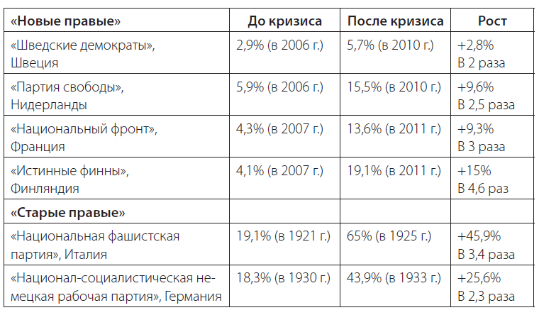 Наиболее ярким свидетельством успеха крайне правых во время и после кризисов является период 1920–1930-х гг., когда к власти пришли Муссолини и Гитлер. В результате потрясений, вызванных банковским кризисом в начале 1920-х гг., и последствий Первой мировой войны на выборах в Италии фашистская партия набрала 19,1 процента голосов в 1921 г. и почти 65 процентов в 1925 году. Исследователи отмечают, что в начале 1930-х гг., когда Великая депрессия ударила по странам Центральной Европы, нацисты получили широкую поддержку в Германии: в 1930 г. это 18,3 процента голосов, в 1932 г. – более 30 процентов голосов и более 40 процентов голосов в 1933 году. И в других европейских государствах ультраправые и нацистские движения усилили позиции: в Испании («Испанская Фаланга» // “Falange Española”), Дании («Национал-социалистическая рабочая партия Дании» // “Danmarks Nationalsocialistiske Arbejderparti”), Бельгии («Рексистская партия» // “Parti Rexiste” и «Фламандский национальный союз» // “Vlaamsch Nationaal Verbond”), Финляндии («Патриотическое народное движение» // “Isänmaallinen kansanliike”), Швейцарии («Национальный фронт» // “Nationale Front”).