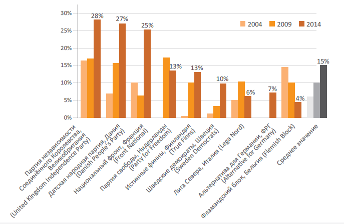 Правильность полученных выводов иллюстрируется и на примере выборов в Европарламент в 2004-м, 2009-м и 2014 годах. График показывает рост популярности правопопулистских движений, при этом пик приходится на период с 2009 по 2014 гг. – последствия финансового кризиса 2008 года. В среднем за десять лет поддержка правых движений увеличилась примерно в 3 раза.