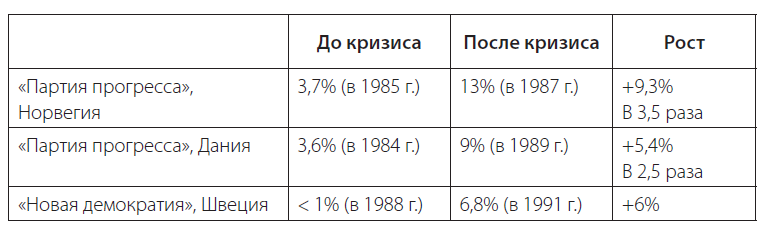 Та же тенденция выявляется и после финансового кризиса 2007–2008 гг., когда поддержка крайне правых и популистов увеличилась более чем вдвое во многих экономически развитых странах, в том числе в Швеции, Великобритании, Франции, Японии, Нидерландах, Португалии и Финляндии.