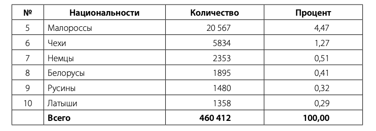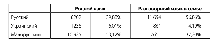 Как видно из таблицы, люди, считавшиеся русскими и разделённые на три группы по родному языку по переписи 1897 г., теперь позиционировались в качестве отдельных национальностей, коих получилось пять – русские, украинцы, малороссы, белорусы и русины. Непродуманность методологии, в соответствии с которой проводилась перепись, привела к серьёзной путанице.