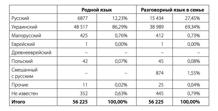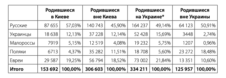 Весьма показательно и то, что если рассматривать людей, родившихся в Киеве, то среди них процент русских и малороссов будет значительно выше, чем если считать среди всех киевлян. В Киеве родились 38,38% киевских русских (87 655 из 228 398 русских, указавших место рождения), 33,36% украинцев (18 638 из 55 866) и 38,75% малороссов (7919 из 20 438), а в границах Украины 1918 г. – 71,92% русских (164 237 из 228 360[30]), 93,83% украинцев (52 428 из 55 876) и 94,09% малороссов (19 232 из 20 439).