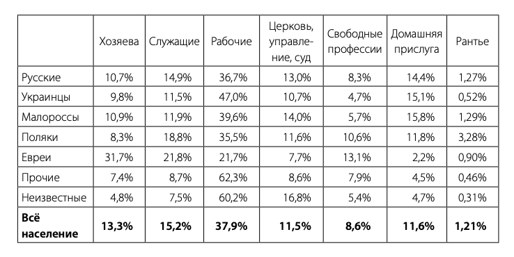 Группа украинцев, таким образом, являлась наиболее «демократической» по своему составу: в ней слабее, чем у других категорий, были представлены бюрократические и помещичьи элементы и, наоборот, сильнее, чем у остальных – рабочие. Если же говорить о русских и малороссах, то по своему социальному составу они были очень схожи, относительный вес хозяев, рабочих, чиновников и рантье у них был почти одинаков[32].