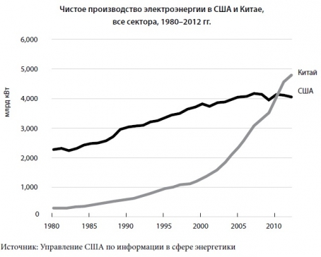 ВВП Китая по-прежнему отстает от ВВП Соединенных Штатов, если считать в нынешних американских долларах. Однако лучший метод сопоставления двух экономик – потребляемое электричество, поскольку это объективный показатель, легко поддающийся измерению. Он во многом отражает уровень модернизации экономики, ведь без электричества невозможно управлять заводами или строить небоскребы, а это именно то, что сегодня делают китайцы. В 1900 г. Китай вырабатывал 0,01% электроэнергии, генерируемой в США. В 1950 г. показатель вырос до 1,2%, а в 2000-е гг. – до 34%. В 2011 г. КНР обошел Америку, так что по крайней мере по потреблению электричества Китай нагнал Соединенные Штаты.