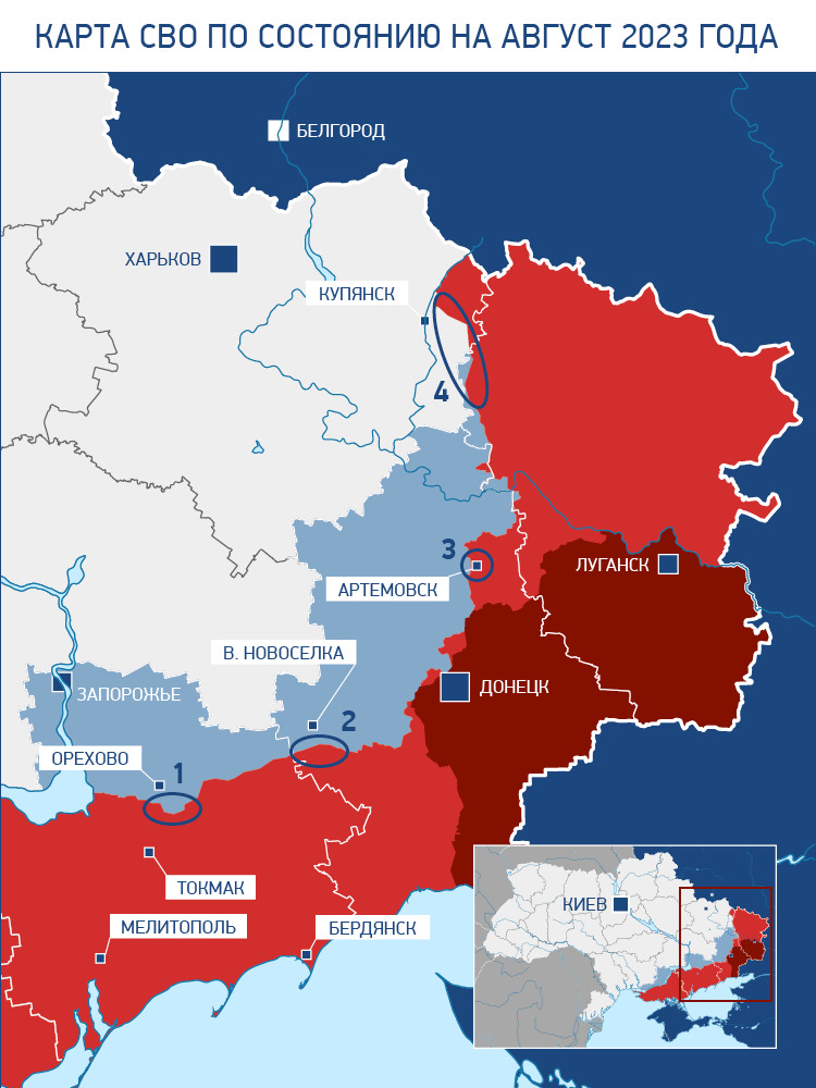 И хотя ВСУ по-прежнему пытаются наступать на Запорожском фронте в районе Орехово-Токмак (см. на карте – 1) и Времеевского выступа (см. на карте – 2), а также под Артёмовском (см. на карте – 3), ставка Запада на военный разгром России руками Украины, видимо, не сработала. В целом на фронте установился хрупкий баланс (или позиционный тупик, кому как больше нравится), следовательно, вопрос военной инициативы и будущего конфликта подвисает в воздухе. Всё чаще говорится о перемирии.