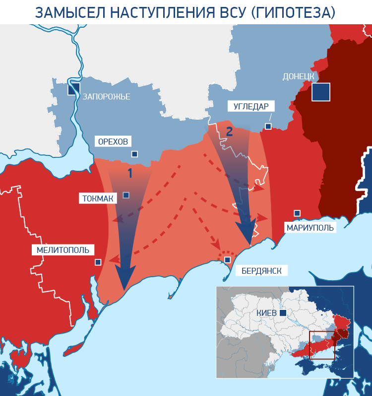 Точного замысла операции мы не знаем, но, похоже, планировалось прорвать нашу оборону в двух местах: в районе Орехова-Токмака (см. на карте – 1) и Времеевского выступа (см. на карте – 2), а затем решительным броском по наиболее танкодоступной местности достичь Азовского моря, заставив все наши войска между Мелитополем и Мариуполем отступать под угрозой окружения. В случае успеха порт Бердянск либо оказывался бы блокированным с суши, либо был бы взят без боя. Не исключено, что Мелитополь в задачи наступления не входил, оставаясь на западном фланге.