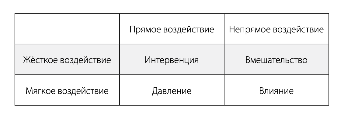 В определении и описании вмешательства и схожих с ним феноменов сложилась концептуальная неопределённость. Первые попытки осмысления привели к смешению понятий «интервенция» и «вмешательство»[25], а некоторые авторы и вовсе заявляют о сущностной неопределимости концепта[26]. В попытках уловить суть происходящих изменений исследователи, эксперты и практики мечутся в поисках возможных решений, предлагая взаимоисключающие варианты разграничения «вмешательства» и «влияния» и множественные типологии форм вмешательства.