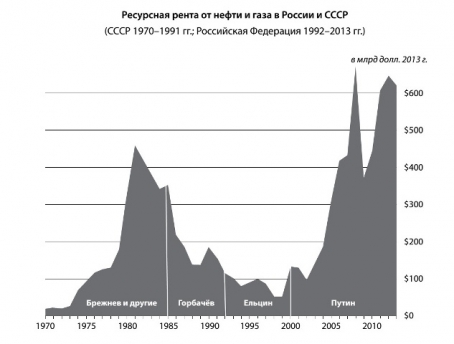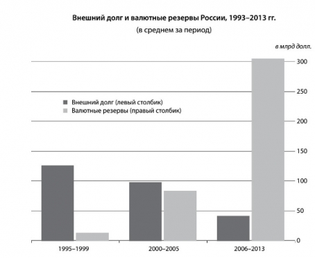 Россия середины 2010-х гг. радикально отличается от той, что была в 1990-е гг., потому что, находясь у власти, Путин использовал ресурсную ренту, дабы избавить страну от долгов перед иностранными государствами и международными организациями. Как показывают цифры, в то время внешний долг правительства Российской Федерации более чем в 10 раз превышал объем валютных резервов. Сегодня наблюдается противоположная картина.