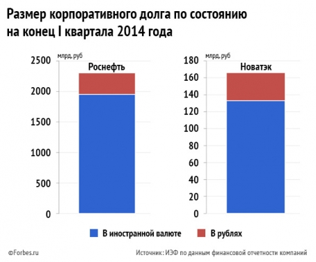 Сильно осложнится привлечение средств именно в долларах — так как оно подразумевает участие американских финансовых институтов в обеспечении расчетов, даже если сами они не выступают держателями долга. По состоянию на конец II квартала четыре компании имели облигационные выпуски и займы, номинированные в долларах, почти на $90 млрд, из них $61,7 млрд приходится на «Роснефть», $3,8 млрд — на «Новатэк». «Роснефть» имеет высокий уровень долговой нагрузки, однако большая часть долга — это долгосрочные синдицированные кредиты, а также средства, полученные в качестве предоплаты от покупателей. Американские санкции затрагивают лишь новый долг, поэтому они усложняют рефинансирование текущей задолженности. В 2015 году четыре компании должны рефинансировать $16,5 млрд «долларовой» задолженности, из которых $14 млрд приходится на «Роснефть». Однако «Роснефть» уже накопила $20 млрд для этих целей и имеет возможность привлечь средства от тех же китайских покупателей.