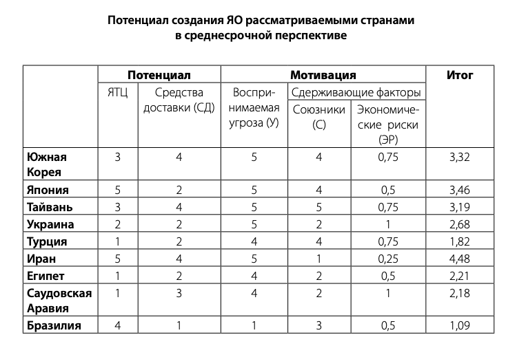 В упомянутом исследовании мы стремились проанализировать наиболее радикальные сценарии, которые могут привести к появлению на политической карте мира новых ядерных государств. В качестве стран и территорий, готовых играть на повышение, помимо очевидного Ирана, рассматривали также менее очевидные Японию, Южную Корею, Тайвань, Турцию, Украину, Саудовскую Аравию, Египет и Бразилию. Именно эти государства, на наш взгляд, могут быть заинтересованы в поддержании неопределённости относительно своих ядерных амбиций – либо в качестве «последнего довода королей», либо в качестве разменной фишки[6].