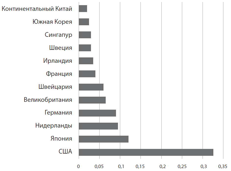 По данным Всемирного банка, мировой объём затрат на приобретение прав использования интеллектуальной собственности (ИС) достиг в 2019 г. 397,233 млрд долларов. В число десяти крупнейших покупателей ИС (см. рисунок 1) входят США, Япония, Нидерланды, Германия, Великобритания, Швейцария, Франция, Ирландия, Сингапур и Швеция. На долю Соединённых Штатов приходится 32,5 процента соответствующих расходов, на долю континентального Китая – всего 1,7 процента.