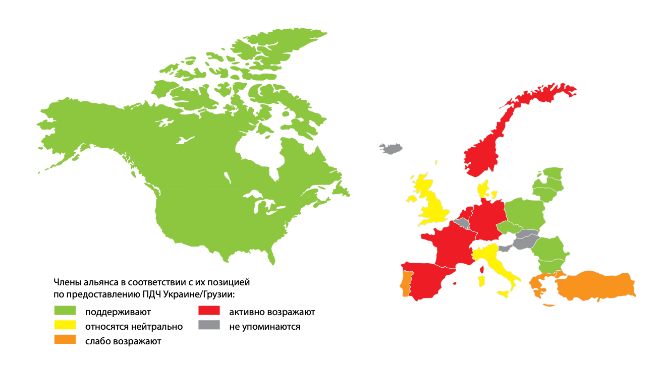 Они сетуют, что Германия сосредоточена на «компенсационной стратегии для России» и настаивает, «что ПДЧ для Украины должен пойти на пользу безопасности всей Европы и это необходимо доказать». Кроме того, Берлин «активно отрицает, что бухарестскую декларацию можно трактовать как согласование членства обеих стран». Германия и Италия пытаются создать рабочую группу, которая будет рассматривать «стратегические расчёты России» в контексте ПДЧ/членства Украины и Грузии. Из документа следует, что американцы возражают против такой инициативы. Так, в середине 2008 г. Соединённые Штаты настойчиво лоббировали ПДЧ для Украины и Грузии, но оказалось, что большинство стран НАТО (и все «старые члены» альянса, кроме Канады) настроены скептически или негативно, в том числе из-за стратегических последствий расширения с точки зрения реакции России. (Вашингтон пытался полностью исключить эту тему из дискуссий.)