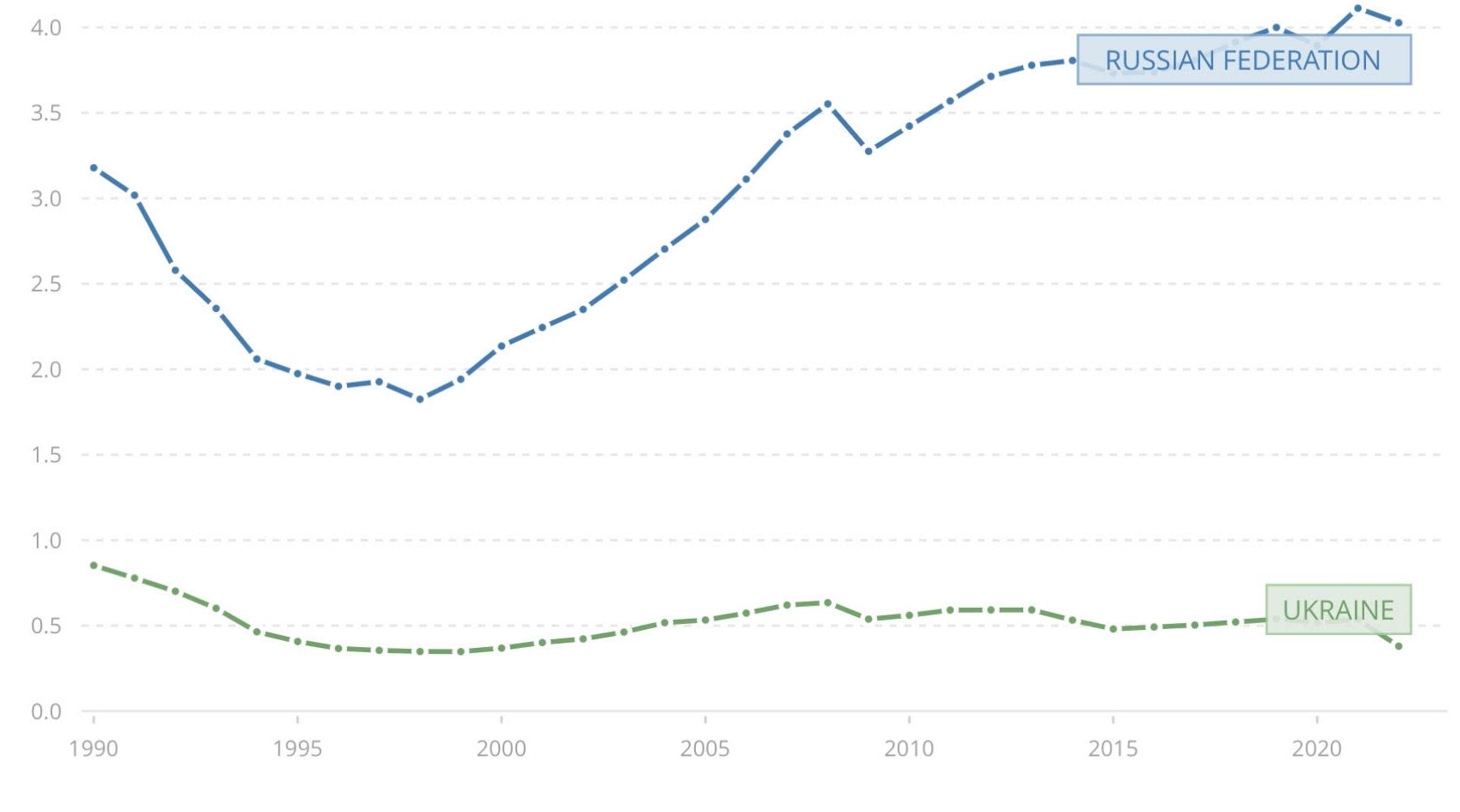 Здесь видно, что Украина за 30 лет практически не выросла. При этом в 1990-х гг. российский трансформационный спад был круче чем украинский. Другой интересный момент – ростом, который начался в России после 2000 г. Украина воспользоваться не могла. Кроме того, падение в 2022 г. в Украине было сильнее спада 1990-х гг.
