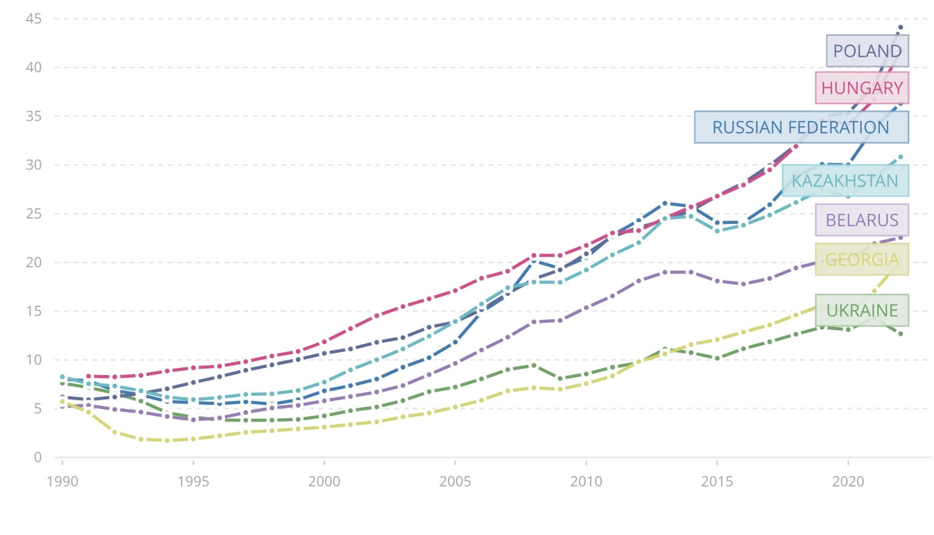 Рис.3. GDP per capita, PPP (current international $) — Russian Federation, Ukraine, Poland, Hungary, Kazakhstan, Belarus, Georgia // The World Bank. URL: https://data.worldbank.org/indicator/NY.GDP.PCAP.PP.CD?locations=RU-UA-PL-HU-KZ-BY-GE (дата обращения: 11.11.2023).