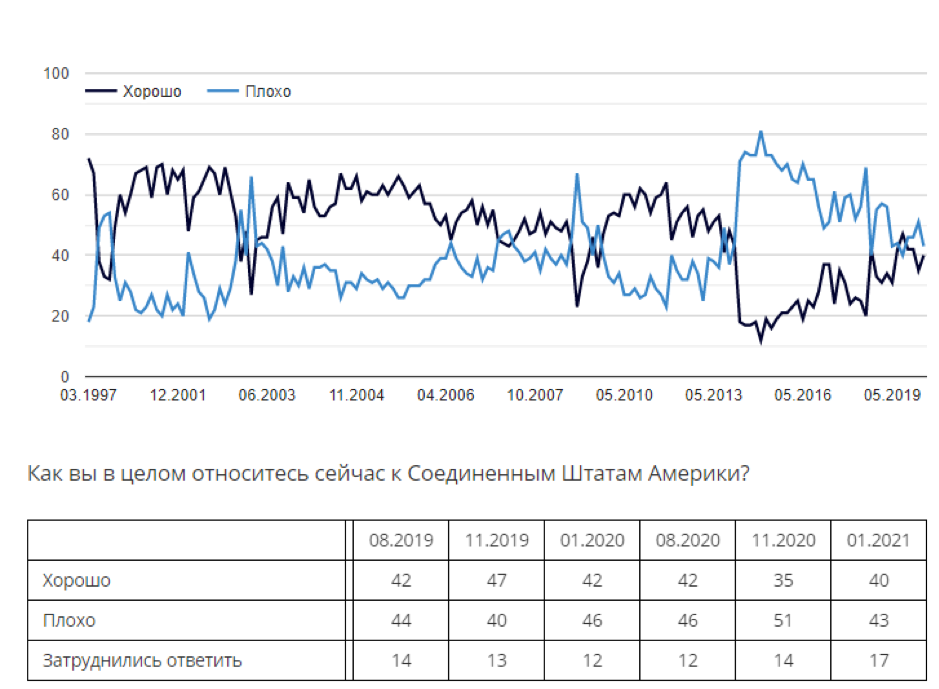 В феврале 2021 г. 40 процентов россиян положительно относились к США, отрицательно – 43 процента. Рост положительного отношения можно отметить впервые с ноября 2019 года.