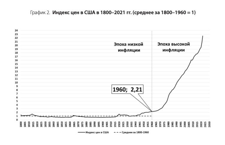 Тем не менее списывать Милтона Фридмана с корабля современности экономический истеблишмент поторопился. Оказалось, что теория его по-прежнему верна[11], а ошибки в конкретных выводах и рекомендациях были обусловлены предметом его многолетних исследований – экономической историей США. Характерная особенность которой – более чем полтора века (1800‒1960) низкой инфляции (график 2).