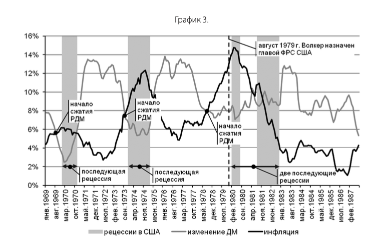 Выход из кризиса начался только тогда, когда возглавивший в августе 1979 г. Федеральный резерв Пол Волкер решительно (значительно выше уровня инфляции) и надолго повысил ставку, но не стал препятствовать денежной массе расти быстрее, чем цены.