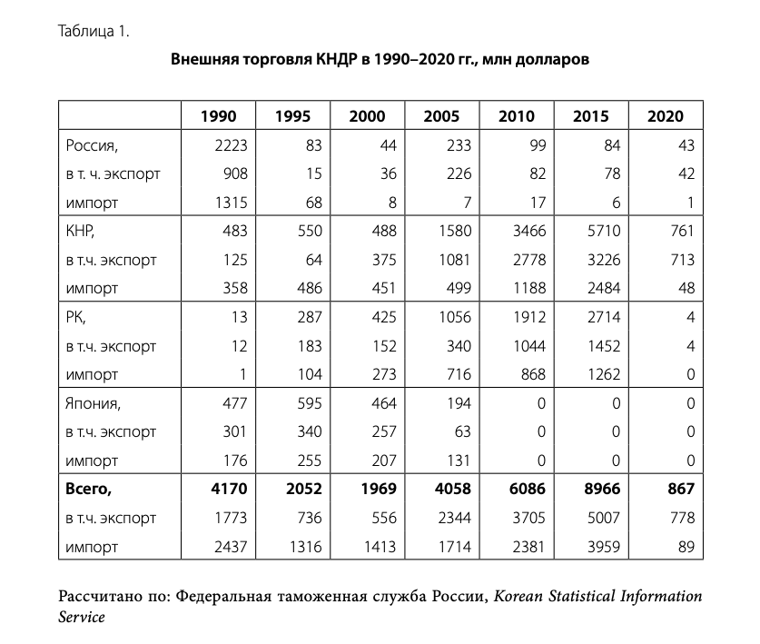 До распада СССР являлся крупнейшим экономическим партнёром КНДР. На его долю в 1970–1980-е гг. приходилось от четверти до половины внешнеторгового оборота республики[1]. При техническом содействии Советского Союза в стране модернизировано и заново построено более семидесяти крупных народнохозяйственных объектов. В 1990 г. удельный вес СССР во внешней торговле КНДР достиг 53,3%, или 2,2 млрд долларов[2], тогда как на долю двух других крупнейших партнёров, Китая и Японии, приходилось, соответственно, 12% и 11%. Но к началу нового века товарообмен сократился в 50 раз до 44,1 млн долларов, или чуть более 2% северокорейского внешнеторгового оборота, в то время как удельный вес КНР возрос до 25%, Республики Корея – до 22% и Японии – до 24% (см. табл. 1).