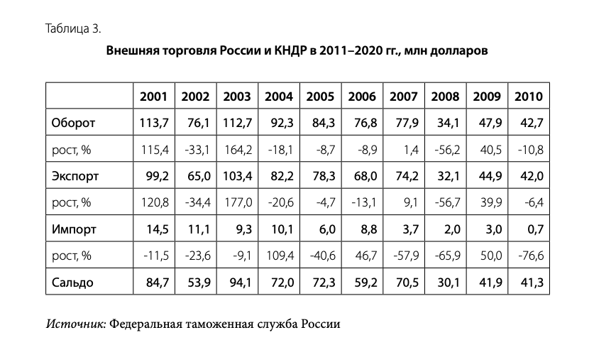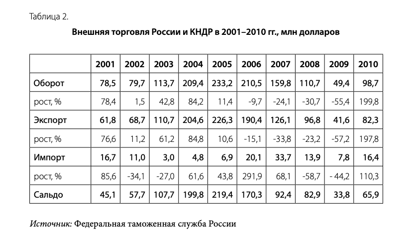 К сожалению, не смогла оживить двустороннее экономическое взаимодействие и наметившаяся реанимация российско-северокорейских политических контактов: подписание в феврале 2000 г. Договора о дружбе, добрососедстве и сотрудничестве между Россией и КНДР, первый за всю историю отношений двух стран визит российского президента Владимира Путина в КНДР и ответные визиты северокорейского лидера Ким Чен Ира в Россию. К 2005 г. взаимный товарооборот увеличился до 233,2 млн долларов, однако дальнейшего восстановительного роста не последовало, объём двусторонней торговли пошёл на спад, достигнув минимума в 49,4 млн долларов в 2009 г. (см. табл. 2) и продолжая колебаться вокруг планки в 100 млн долларов в последующее пятилетие.