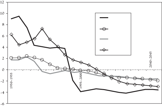 Иное дело в Германии, Италии и Испании – странах со «сверхнизкой» рождаемостью. В Германии сохранение иммиграции в нынешних – немалых – масштабах не сможет предотвратить сокращение населения в трудоспособном возрасте. Поэтому для сохранения сектора услуг придется, например, сократить число занятых в промышленности и сельском хозяйстве к 2020 году на 18 %, а к 2050-му – на 90 %. Положение Италии экстремально. Демографически обусловленное сокращение занятости в промышленности уже к 2020 году должно составить 36 %, а к 2050-му придется пожертвовать не только всей промышленностью и всем сельским хозяйством, но и почти половиной (44 %) сферы услуг. Поскольку демографические параметры России очень близки к итальянским, перспективы обеспеченности российской экономики трудовыми ресурсами столь же удручающи.